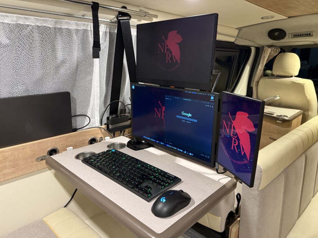 帰宅してからは3Dプリンタとフリクションヒンジを使って車内でトリプルディスプレイで作業できる様なマウンタ作ったりも。