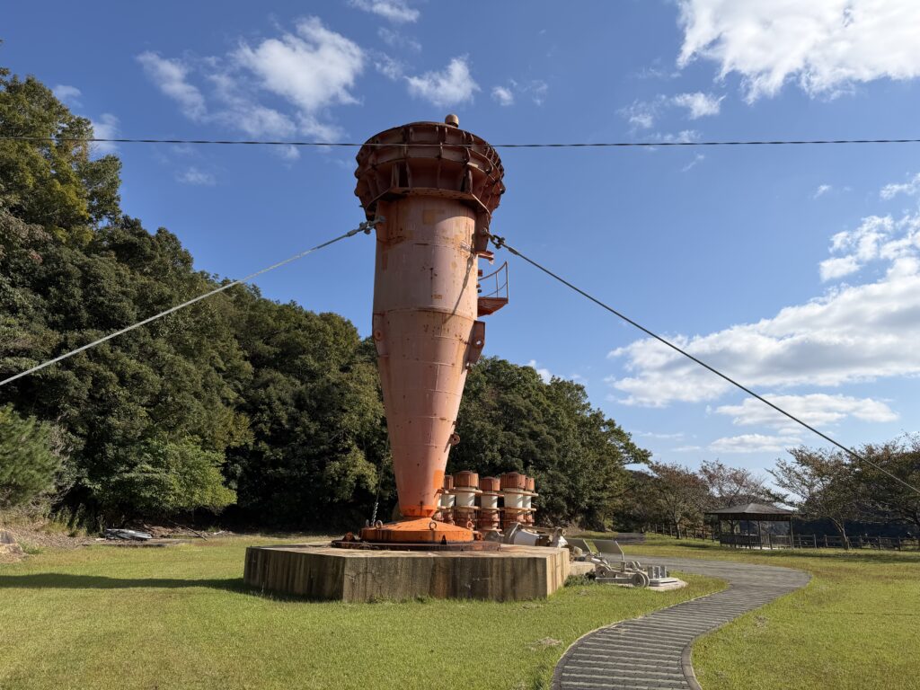 いまは測位システムはGPSが担っていますが、昔はオメガ航法システムという方法が使われていて、世界に8つあるオメガ塔と呼ばれる電波塔から発する電波で即位していたそうで、その1つがオメガ公園にある高さ455mの対馬オメガ局だったそうです。