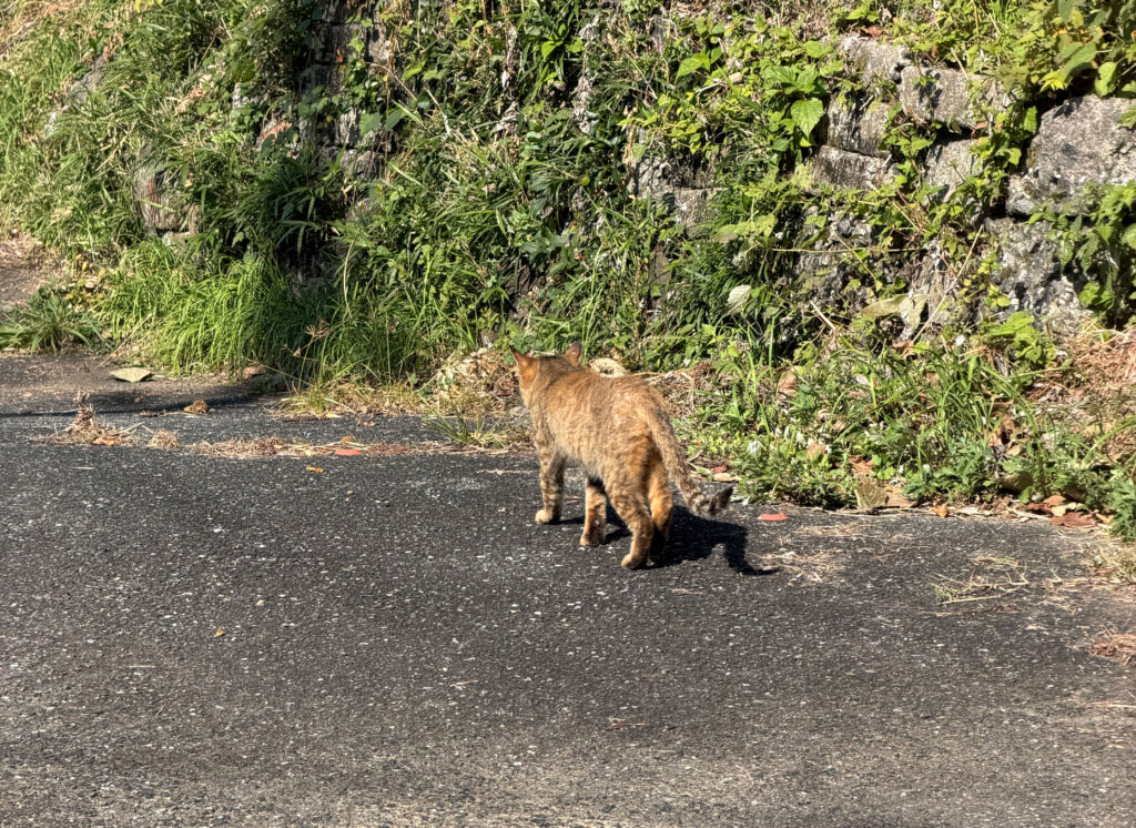 道すがら猫が歩いていて、すわツシマヤマネコか!?と色めきだつ我々。でもこの後行った対馬野生生物保護センターで解説されていた特徴と付き合わせるにツシマヤマネコではなくタダノイエネコだった様です。